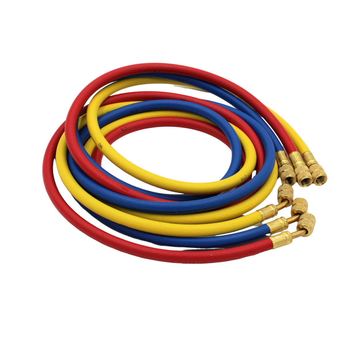 Hose set suitable for: R12, R134a, R22, R32, R401, R404, R406, R408, R410A, R411, R412, R500, R502, R509, 1234yf, and most CFC’s, HCFC’s and HFC’s