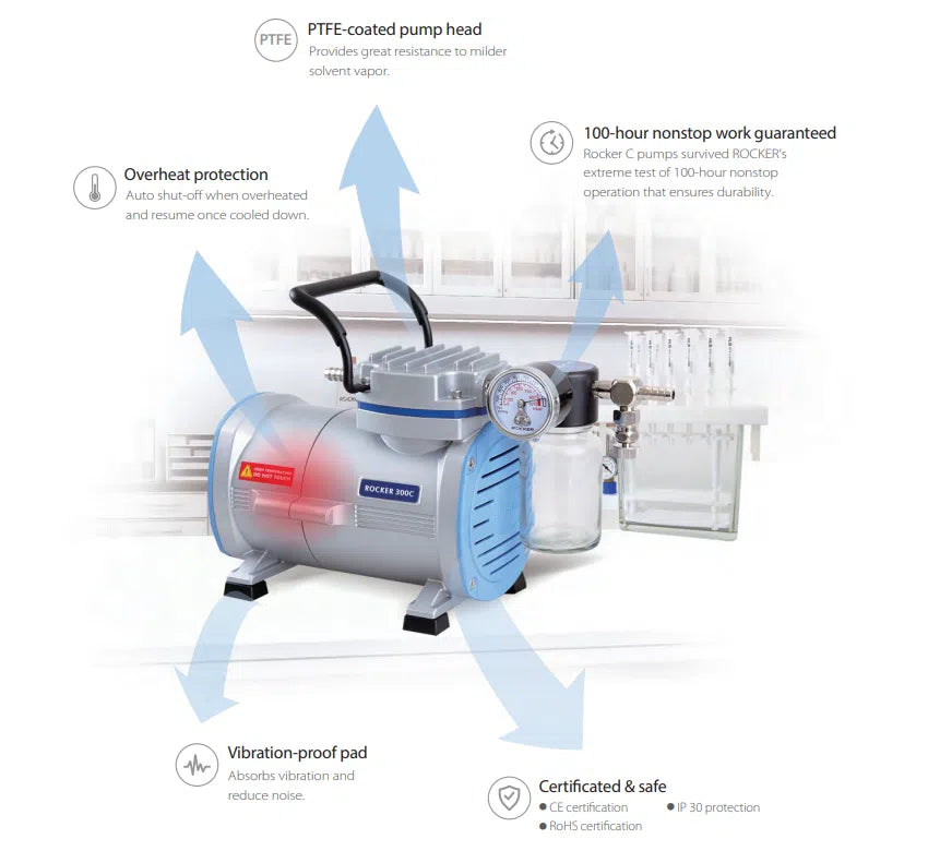 The diaphragm chamber of Rocker 410C vacuum pump coated with PTFE can offer good resistance to a wide range of corrosive gases except strong acid and alkali. - No air pollution, maintenance free