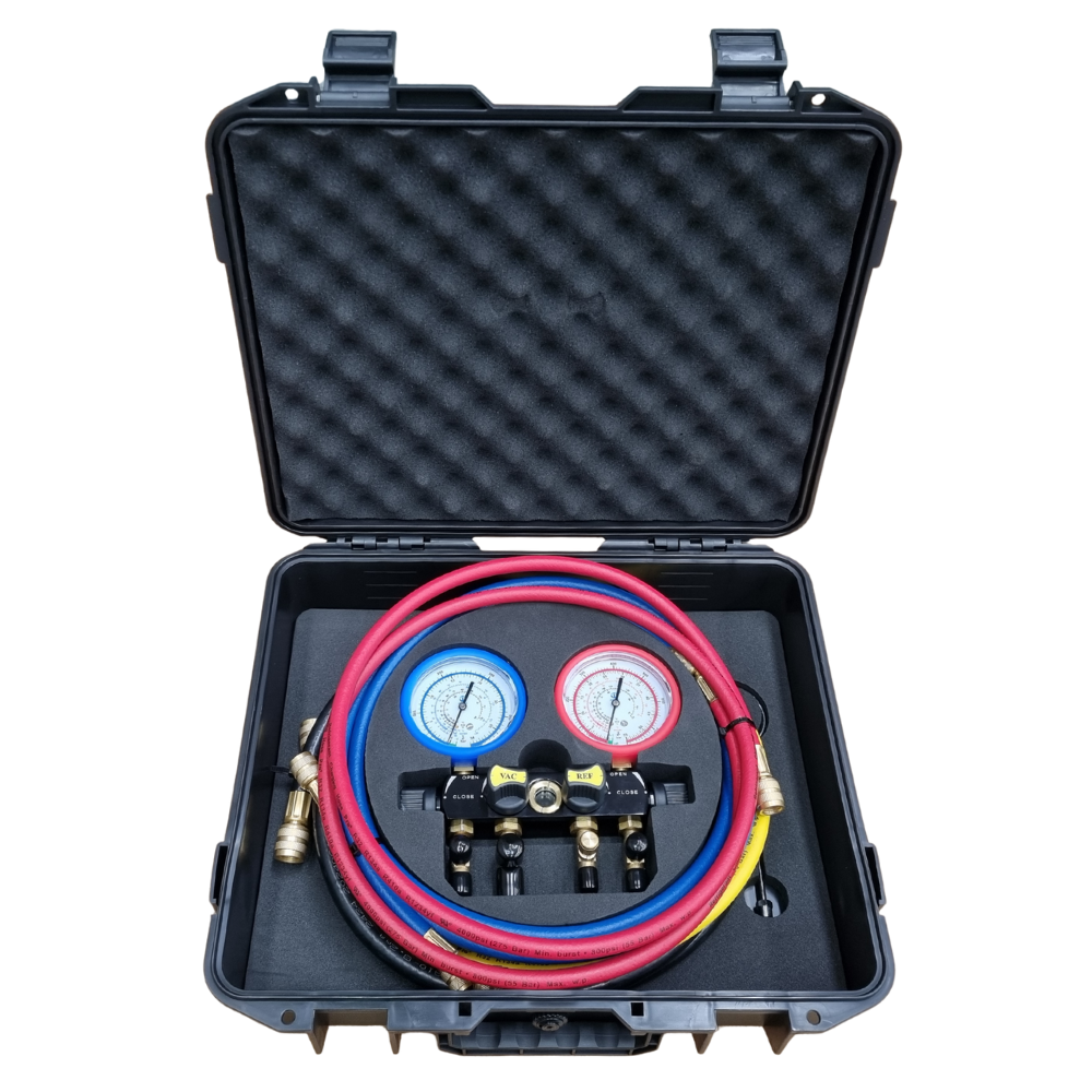 - Included: 4-Valve Refrigeration Manifold, 4-piece hose set, hanging manifold hook & carry case